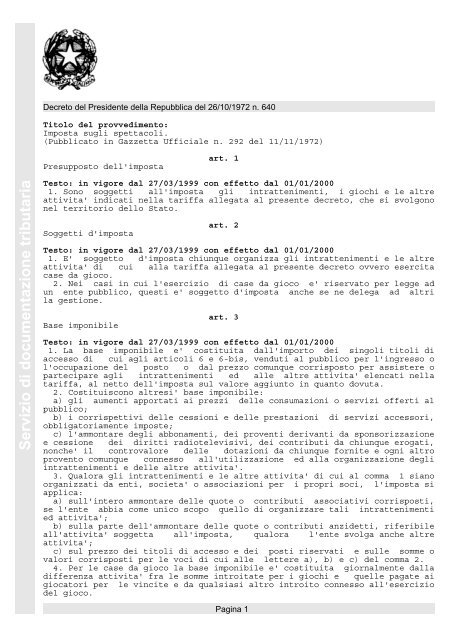 DECRETO DEL PRESIDENTE DELLA REPUBBLICA 26 ottobre 1972, n. 633 Istituzione e disciplina dell'imposta sul valore aggiunto. (GU n.292 del 11-11-1972 - Suppl. Ordinario n. 1) Art. 17. Debitore d'imposta. L'imposta e' dovuta dai soggetti che effettuano le cessioni di beni e le prestazioni di servizi imponibili, i quali devono versarla all'erario, cumulativamente per tutte le operazioni effettuate e al netto ... Documentazione Economica e Finanziaria - Risultati ricerca Le disposizioni del presente articolo, come modificato, da ultimo, dall' art. 1, comma 330, lett. b) legge 24 dicembre 2012 n. 228, si applicano alle operazioni effettuate a partire dal 1 gennaio 2013. Articolo 8 Cessioni all'esportazione. In vigore dal 12/12/2017 In vigore dal 01/01/2013 In vigore dal 11/12/2012 Art. 72 - Operazioni non imponibili. (Dpr 633/72) - GBsoftware a) le cessioni di beni e le prestazioni di servizi effettuate nei confronti delle sedi e dei rappresentanti diplomatici e consolari, compreso il personale tecnico-amministrativo, appartenenti a Stati che in via di reciprocita' riconoscono analoghi benefici alle sedi e ai rappresentanti diplomatici e consolari italiani;